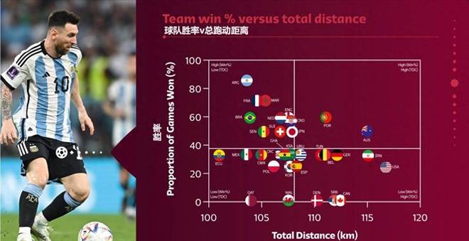比如阿根廷、巴西和法国队的跑动量都不到105公里,相对跑动量更高的葡萄牙、比利时和德国队要么折戟16强,要么直接小组赛出局。