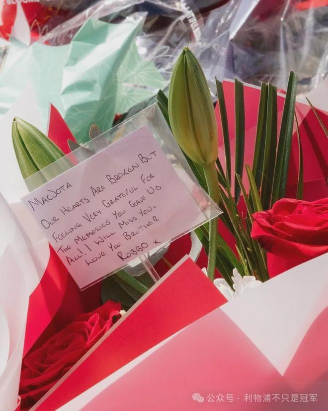我在網絡上搜索著羅伯遜和若塔的圖片,除瞭那一張張擁抱和歡笑的照片,還有一張卡片,那是羅伯遜在七月份在安菲爾德球場外悼念若塔、敬獻鮮花時,寫給若塔的卡片:
