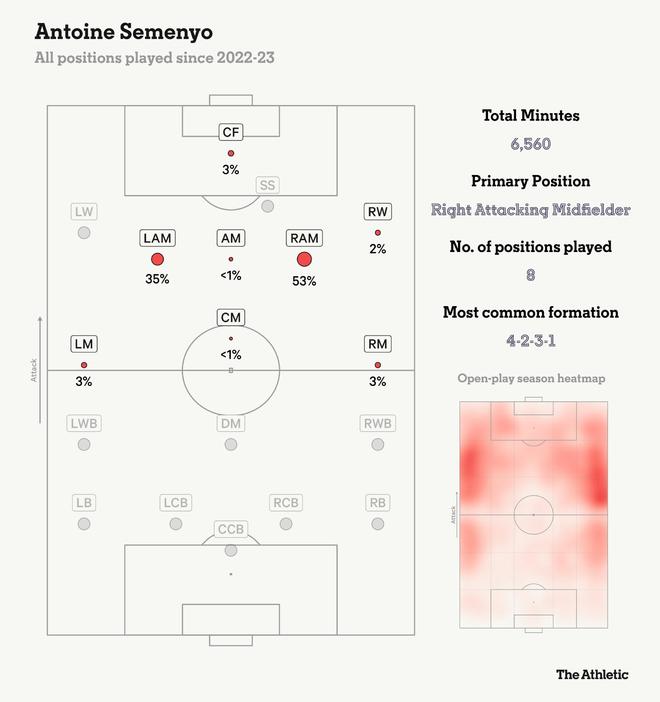 他理想情況下可以擔任曼聯3-4-3陣型中的右側攻擊型中場,但也能勝任兩翼,並且具備防守意識,可以適應邊翼衛的位置之一。阿莫林偏愛雙腳均衡的邊路球員,這使他能夠指導鋒線三人和邊翼衛在進攻三區進行更多的輪轉換位,從而更好地破解密集防守。這位加納國腳快速的帶球突破和大幅改善的射門狀態(如下方圖表所示,該圖表顯示他對射門的選擇變得更加精挑細選),也將使他成為球隊在由守轉攻時的又一個出色的反擊選擇,而曼聯在攻防轉換階段的威脅是最大的。