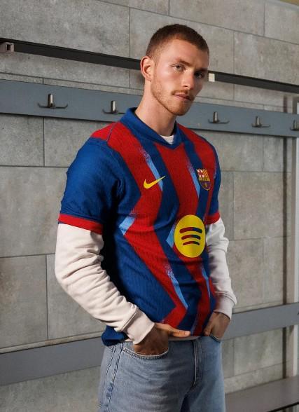 新球衣的设计中,巴萨的条纹以垂直但看似无序的方式呈现,这并非无关紧要的细节。线条灵感来源于那晚三个进球的轨迹,第一个由埃托奥打入,接下来的两个由罗纳尔迪尼奥完成。