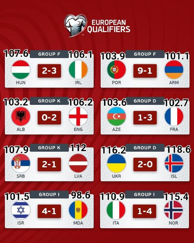 从世预赛统计数据可以看到,除了乌克兰队2比0击败冰岛队,以及意大利与挪威队的比赛,4支球队完成了让人吃惊的跑动量,其他比赛的平均跑动量甚至低于105公里。