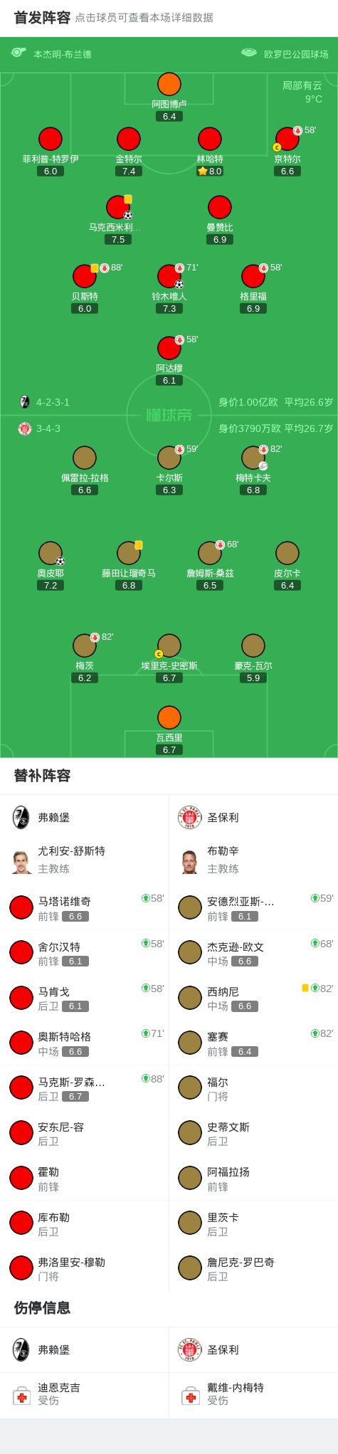 北京时间11月9日德国足球顶级联赛 联赛 第10轮,弗赖堡主场对阵圣保利。弗赖堡铃木唯人破门,马克西米利安-埃格施泰因破门。圣保利奥皮耶破门。最终比分弗赖堡 2-1 圣保利。